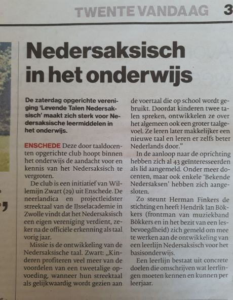Mooi artikel in de kraant van 11 oktober 2019 oaver oonze taal en 't Twentehoes