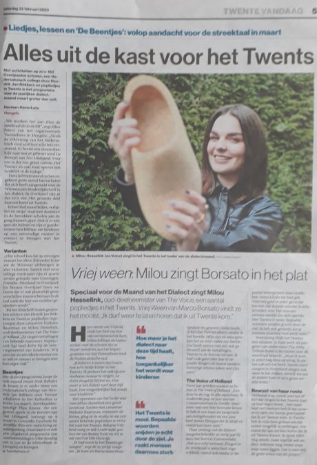 Artikel in de Twentse Kraant van 22 feebrarie 2020 oaver de dialectmoand meert 2020.