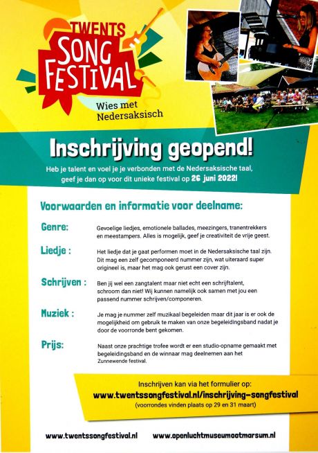 Mooie liedjes in de eigen streektaal : ‘dat sprekt oe an en doar mo’j na gek met wèn !’. Dus zet het vast in de agenda : zondag 26 juni op naar Ootmarsum, Openluchtmuseum. Het begint om 14.00 uur. De reguliere entreeprijzen zijn € 7,- p.p. en kinderen beneden de 10 jaar kunnen gratis mee.