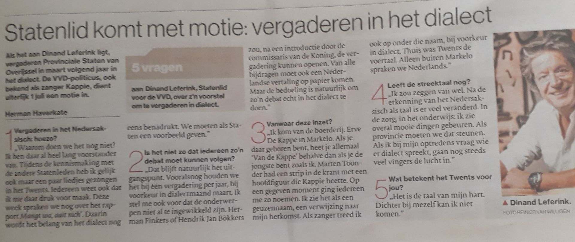 Mooi artikel in de kraant van 11 oktober 2019 oaver oonze taal en 't Twentehoes