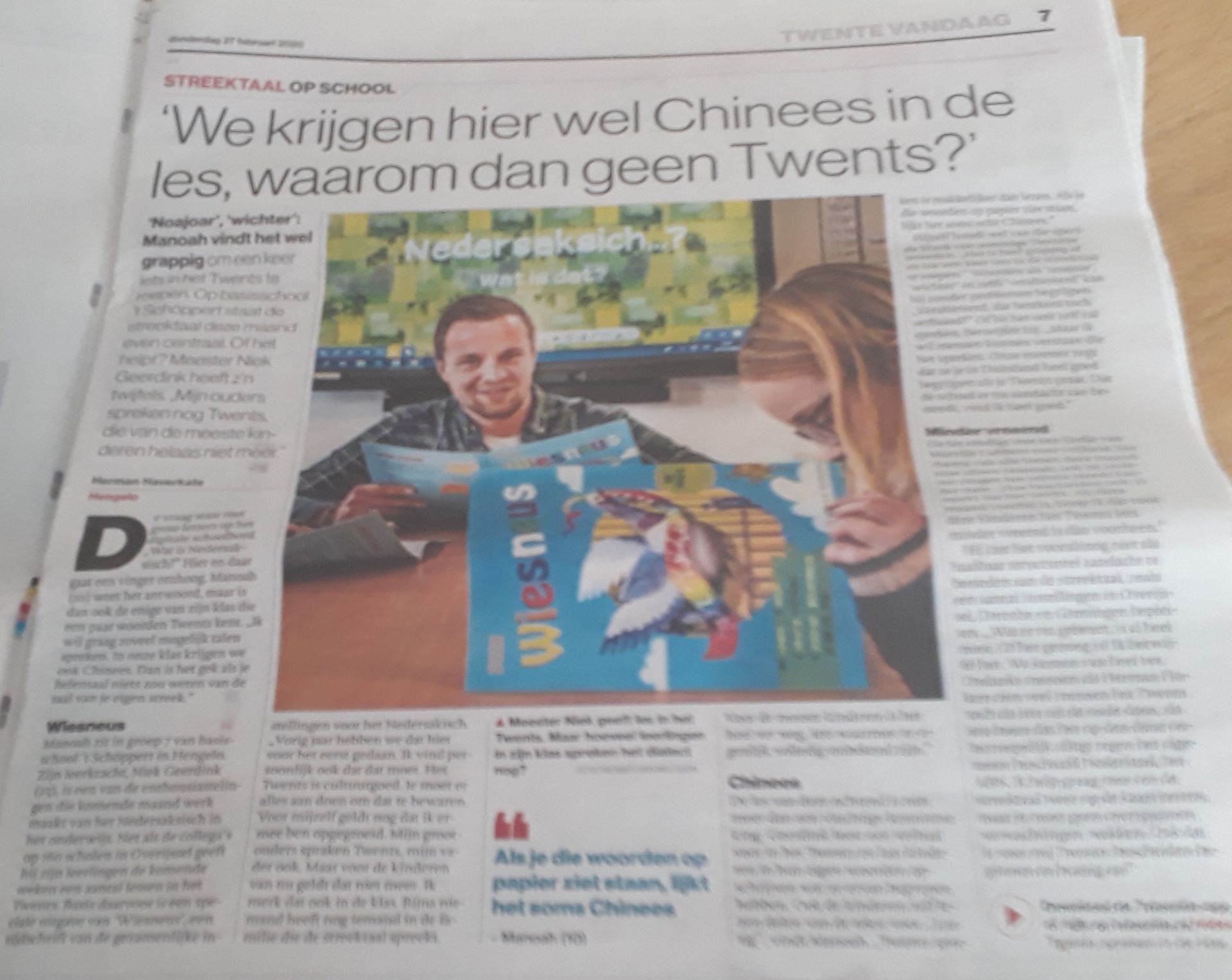 In janwarie 2020 is d'r wier nen niejen Wiesneus oet-ekommen. Dit is een dialectschrift dat op de scholen wödt e-broekt. Al 160 basisscholen in Overiessel hebt dit blad besteld um in de klasse te gebroeken. Oonder leiding van Willemijn Zwart, wzwart@ijsselakademie.nl is t'er lesmateriaal ontwikkeld met achtergroondartikels oaver 'n inzet van streektaal in de klasse en 'n oproop um oe an te sloeten biej Levende Talen Nedersaksisch, nen docentenvereniging vuur de streektaal. De Wiesneus zit boordevol leedjes, vuurleesverhaaltjes en puzzels en met de biehörenden lesbreef kö'j dreks beginnen.