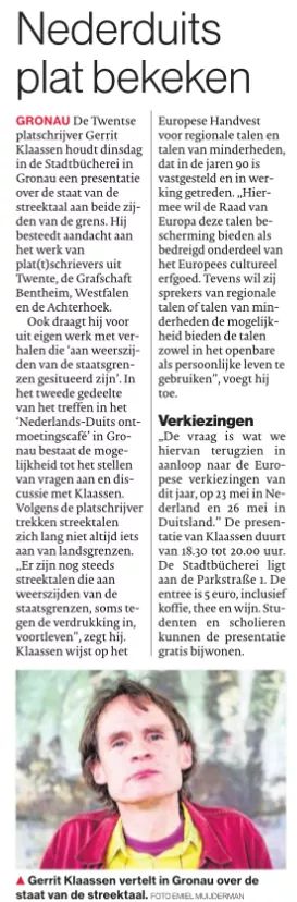 Umdat hee eerder joaren in de organisatie zat van de Taalpries, keek hee doar zölf aait achter daal, dus wörden ’t noe de hoogste tied um zölf die pries te kriegen den hee heel dik hef verdeend!